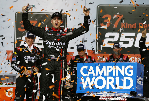 Noah Gragson, the driver of the #18 Safelite Toyota, celebrates in victory lane after winning the NASCAR Camping World Truck Series 37 Kind Days 250 at Kansas Speedway on May 11, 2018, in Kansas City, Kansas. Photo – Sarah Crabill/Getty Images