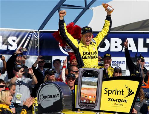Matt Kenseth, driver of the #20 Dollar General Toyota, celebrates in Victory Lane after winning the NASCAR Sprint Cup Series Kobalt Tools 400 at Las Vegas Motor Speedway on March 10, 2013