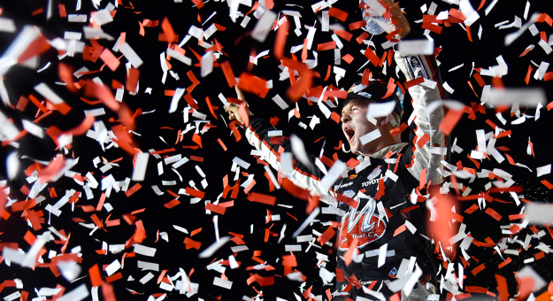 MARTINSVILLE, VA – OCTOBER 27: Johnny Sauter, the driver of the #21 ISM Connect Chevrolet, poses with the winner’s decal on his truck in Victory Lane after winning the NASCAR Camping World Truck Series Texas Roadhouse 200 presented by Alpha Energy Solutions at Martinsville Speedway on October 27, 2018, in Martinsville, Virginia.