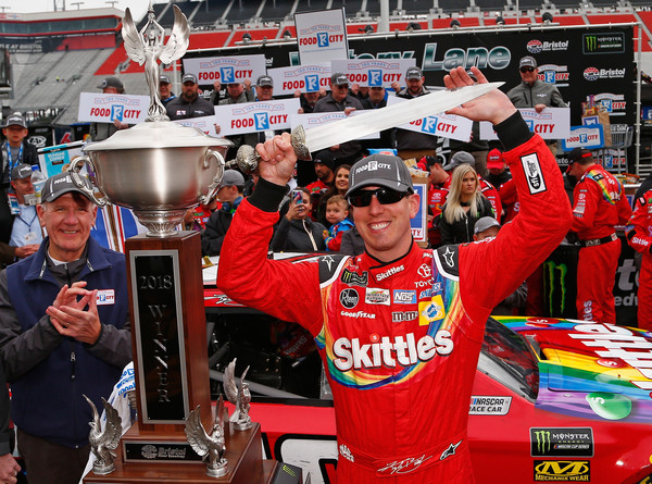 Kyle Busch, the driver of the #18 Skittles Toyota, poses with the trophy in victory lane after winning the rain-delayed Monster Energy NASCAR Cup Series Food City 500 at Bristol Motor Speedway on April 16, 2018, in Bristol, Tennessee. Photo – Matt Sullivan/Getty Images
