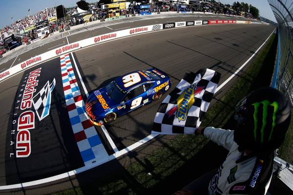 Chase Elliott, the driver of the #9 SunEnergy1 Chevrolet, takes the checkered flag to win during the Monster Energy NASCAR Cup Series GoBowling at The Glen at Watkins Glen International on August 5, 2,018 in Watkins Glen, New York. Photo – Jeff Zelevansky/Getty Images