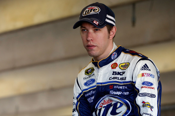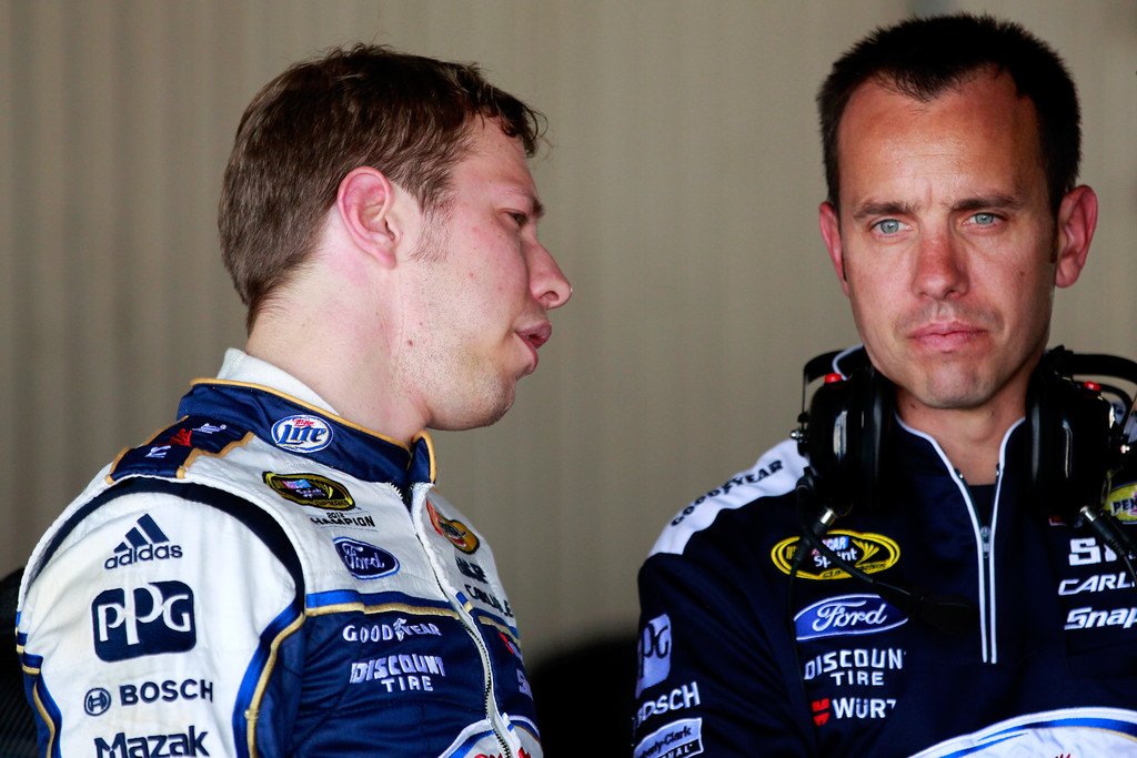 (L-R) Brad Keselowski, driver of the #2 Miller Lite Ford, talks with crew chief Paul Wolfe during practice for the NASCAR Sprint Cup Series FedEx 400 benefiting Autism Speaks at Dover International Speedway on May 31, 2013