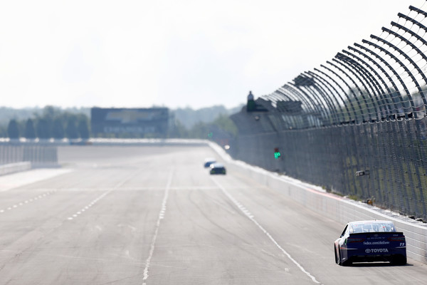 Denny Hamlin, the driver of the #11 FedEx Express Toyota, practices for the Monster Energy NASCAR Cup Series Gander Outdoors 400 at Pocono Raceway on July 28, 2018, in Long Pond, Pennsylvania. Photo – Jeff Zelevansky/Getty Images