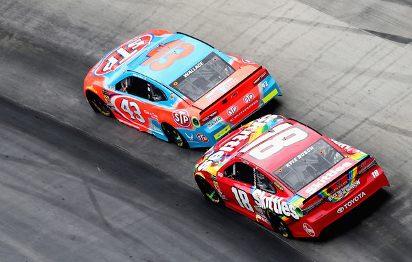 Darrell Wallace Jr., the driver of the #43 STP Chevrolet, and Kyle Busch, driver of the #18 Skittles Toyota, race during the rain delayed Monster Energy NASCAR Cup Series Food City 500 at Bristol Motor Speedway on April 16, 2018, in Bristol, Tennessee. Photo – Jerry Markland/Getty Images