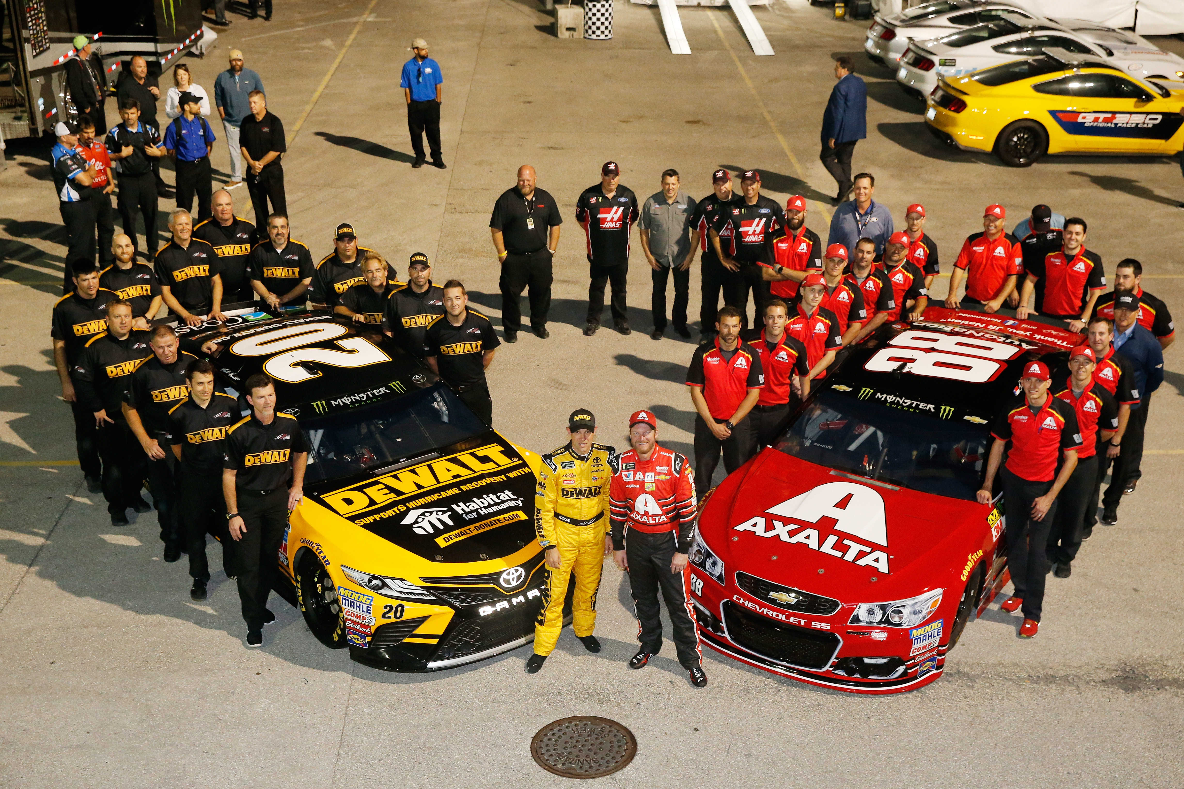 HOMESTEAD, FL – NOVEMBER 17: Matt Kenseth, driver of the #20 DeWalt Hurricane Relief Toyota, and Dale Earnhardt Jr., driver of the #88 AXALTA Chevrolet, and members of their teams pose for a photo after qualifying for the Monster Energy NASCAR Cup Series Championship Ford EcoBoost 400 at Homestead-Miami Speedway on November 17, 2017 in Homestead, Florida. Photo by Jonathan Ferrey/Getty Images