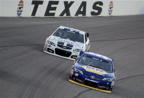 Martin Truex Jr., driver of the #56 NAPA Auto Parts Toyota, and Jimmie Johnson, driver of the #48 Lowe's Dover White Chevrolet, race during the NASCAR Sprint Cup Series race at Texas Motor Speedway on April 13, 2013  Photo - Sean Gardner/Getty Images