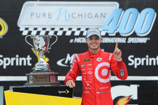 Kyle Larson, driver of the #42 Target Chevrolet, celebrates in victory lane after winning the NASCAR Sprint Cup Series Pure Michigan 400 at Michigan International Speedway on August 28, 2016 in Brooklyn, Michigan. Photo - Dylan Buell/Getty Images