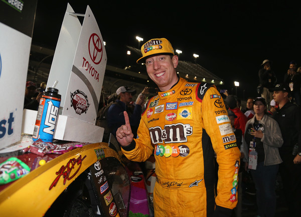 Kyle Busch, the driver of the #18 M&M’s Flavor Vote Toyota, poses with the winners’ sticker after winning the Monster Energy NASCAR Cup Series Toyota Owners 400 at Richmond Raceway on April 21, 2018, in Richmond, Virginia. Photo – Matt Sullivan/Getty Images