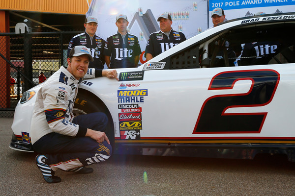 Brad Keselowski, the driver of the #2 Miller Lite Ford, poses with the Coors Light Pole Award decal after qualifying for the pole position for the Monster Energy NASCAR Cup Series Pure Michigan 400 at Michigan International Speedway on August 11, 2017, in Brooklyn, Michigan. Photo – Sean Gardner/Getty Images
